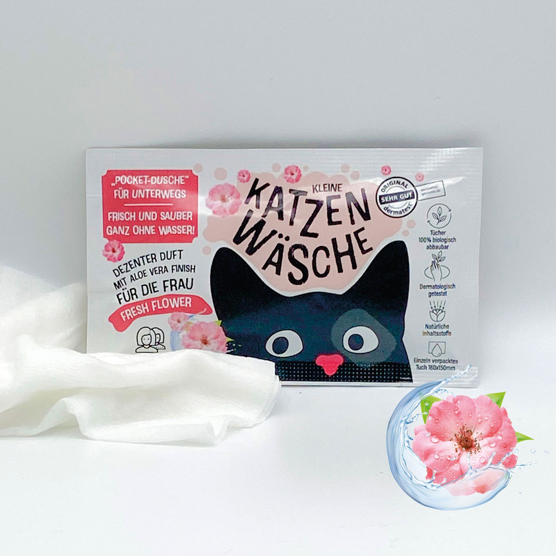 Super flauschiges Waschtuch im Einzelsachet, optimal zum Mitnehmen in der Handtasche, 100% biologisch abbaubar und mit neutralem FRESH WATER Duft für alle und coolem Mint für die Männer. Abgeschlossen wird die Waschung zwischendurch mit einem Hauch Aloe Vera, der die Haut sanft und geschmeidig macht.